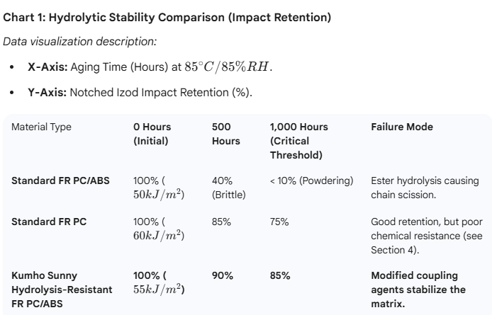Standard FR PC/ABS is susceptible to ester bond cleavage when exposed to moisture and heat. Over time, this causes a catastrophic loss of molecular weight and mechanical properties.