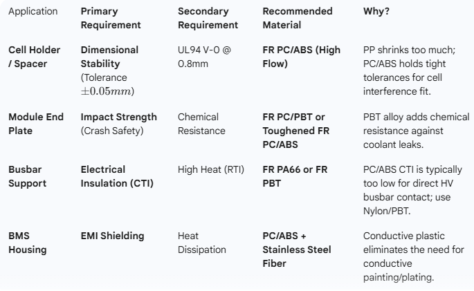 The electrification of the automotive powertrain has shifted material requirements from “Heat & Oil Resistance” (Internal Combustion) to “Electrical Safety & Chemical Stability” (EV). Specifically, Battery Module Housings, Cell Spacers, and High-Voltage Connectors require a unique balance of properties that standard commodity plastics cannot meet. This technical paper provides a selection framework for Flame Retardant (FR) PC/ABS, analyzing the critical trade-offs between UL94 V-0 ratings, Hydrolysis Resistance (PCT aging), and Environmental Stress Cracking Resistance (ESCR) against liquid coolants. We present validation data based on UL746B and GMW3059 to guide engineers in selecting the correct grade for 800V architectures.