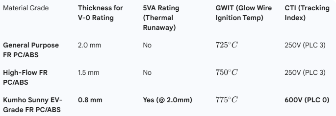 Selecting the right FR PC/ABS is no longer just about checking the datasheet for “UL94 V-0.” In the era of EVs, the material must pass a gauntlet of reliability tests.