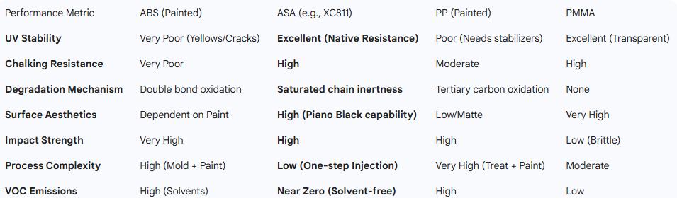 In the competitive arena of automotive materials, ASA demonstrates a clear advantage when balancing weathering performance, aesthetics, and total system cost.