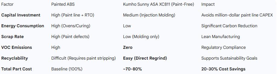 - The ASA Advantage: Mold-in-Color using XC811 eliminates the entire painting step. While ASA resin is roughly 10-20% more expensive than raw ABS, the total system cost drops by 20-30% by removing the secondary operations, logistics, and yield losses associated with painting.